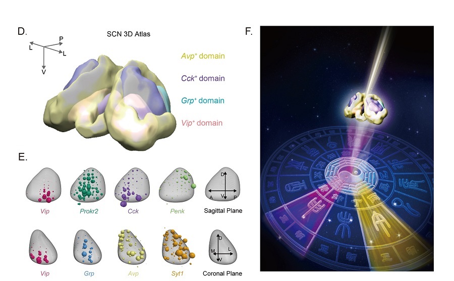 圖注 D:用透明化成像得到的SCN神經元亞型的三維空間分布。E:從LCM-seq獲得的SCN中基因的三維空間表達。F:這張圖寓意SCN作為生物節律核心起搏器,把光信號轉換為節律信號,并產生不同相位的振蕩,折射到中國古老的日晷上的不同時辰。