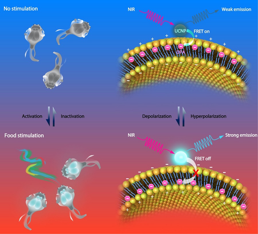 圖注:電壓納米探針的設計及其感應機理。首先,UCNPs固定在神經元細胞膜上。其次,將六硝基二苯胺(DPA)嵌入細胞膜磷脂雙分子層。在神經元靜息狀態下,帶負電荷的DPA在細胞膜外側富集,UCNP與DPA之間形成發光共振能量轉移體系(FRET),UCNPs發光被DAP吸收,檢測到的光信號弱。當神經元去極化后,DPA在電場作用下在細胞膜內側富集,FRET效應減弱,從而恢復UCNPs的發光。