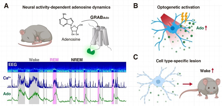 睡眠是動物界普遍存在的現象,人類大約有三分之一的時間用于睡眠。然而睡眠是如何被調節的目前尚不清楚。經典的睡眠調控模型認為,睡眠的調節分為兩個方面,晝夜節律和睡眠穩態。晝夜節律通過內在的生物鐘控制一天中睡眠覺醒的時間;睡眠穩態主要由睡眠壓力進行調控,控制機體獲得一定的睡眠量。隨著清醒時間的延長,睡眠壓力逐漸增加;隨著睡眠的進行,睡眠壓力被逐漸清除。睡眠穩態調節系統會在睡眠受到干擾時發揮作用,例如:熬夜之后睡得更“香”并且時間更長。目前,主流理論認為“腺苷”參與到睡眠穩態調節過程中,其在清醒狀態下的積累導致了“困意”的產生,而咖啡的主要成分咖啡因可以通過阻斷腺苷與其受體的結合而達到促進清醒的效果。基底前腦被認為是腺苷參與睡眠穩態調控的重要腦區,環路層面的研究表明,該區域的局部神經環路參與到對睡眠覺醒的調控中,然而神經元活動調控腺苷釋放的機制目前還不清楚。這限制了人們對睡眠覺醒調控機制的深入解析。