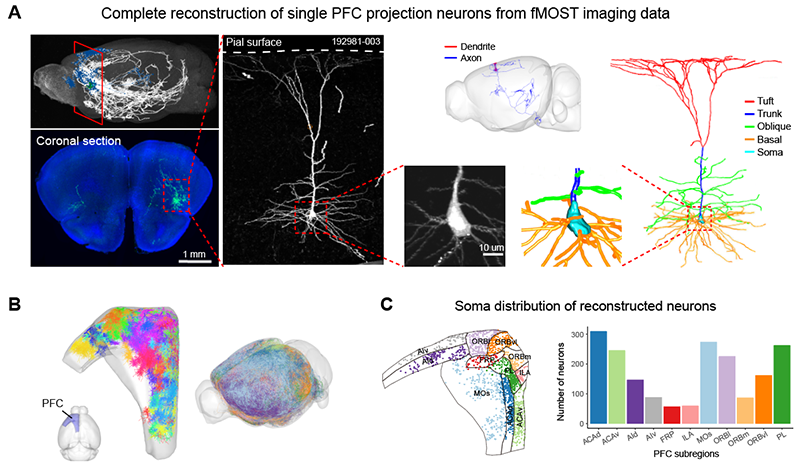 圖1 神經(jīng)元樹突和軸突形態(tài)的完整重構(gòu)。(A)fMOST原始圖像和單神經(jīng)元重構(gòu)結(jié)果。(B)重構(gòu)的前額葉皮層神經(jīng)元(n=1920)的樹突和軸突。(C)重構(gòu)神經(jīng)元胞體在前額葉皮層亞區(qū)的空間分布。